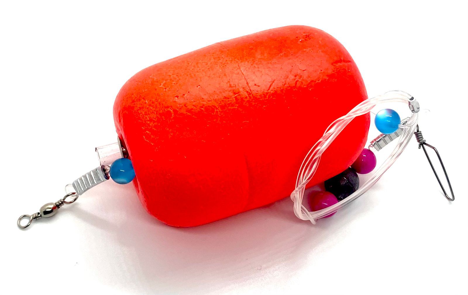 Componentes: 1 girador nº1, 1,20m de linha de nylon 1.4mm, 1 chumbo de até 20g, 1 Bóia de isopor, 1 snap de engate rápido, miçangas, presilha de alumínio, Ilhós, e um Suporte para luminoso com 2cm de mangueira de PVC.