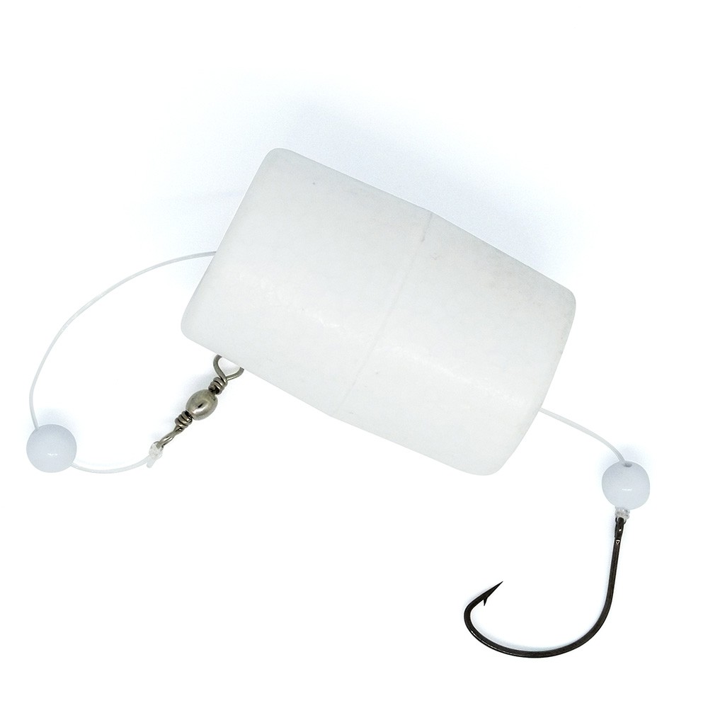 Componentes: 1 girador nº5, 25 cm de linha de nylon 0,60 mm, 1 bóia de isopor, 1 anzol wide gap 1/0 e miçangas