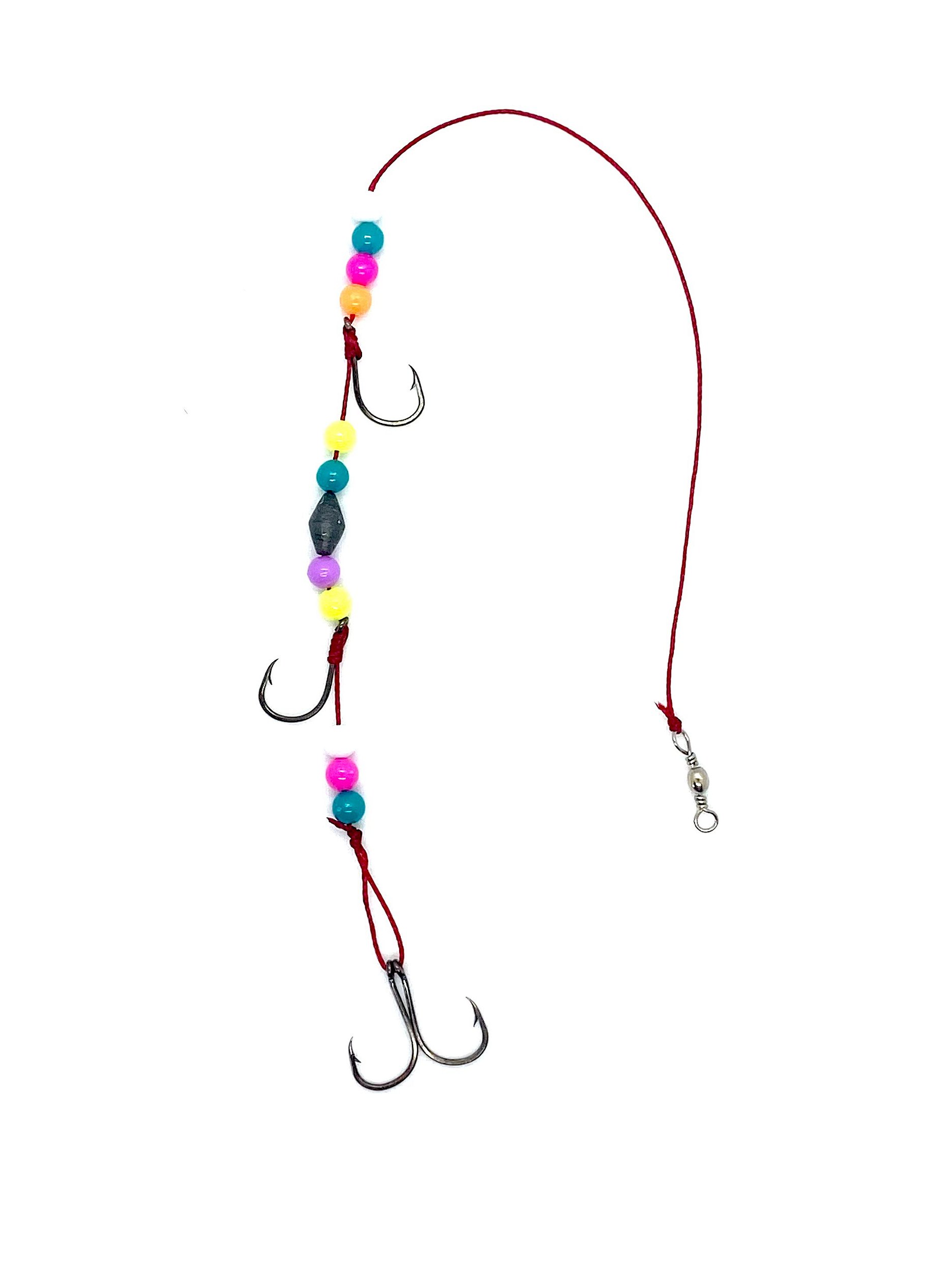 Componentes: 1 girador N5, 40cm de linha 0.35mm, miçangas, 1 chumbo de aproximadamente 10 gramas e 4 anzóis Chinu 7.