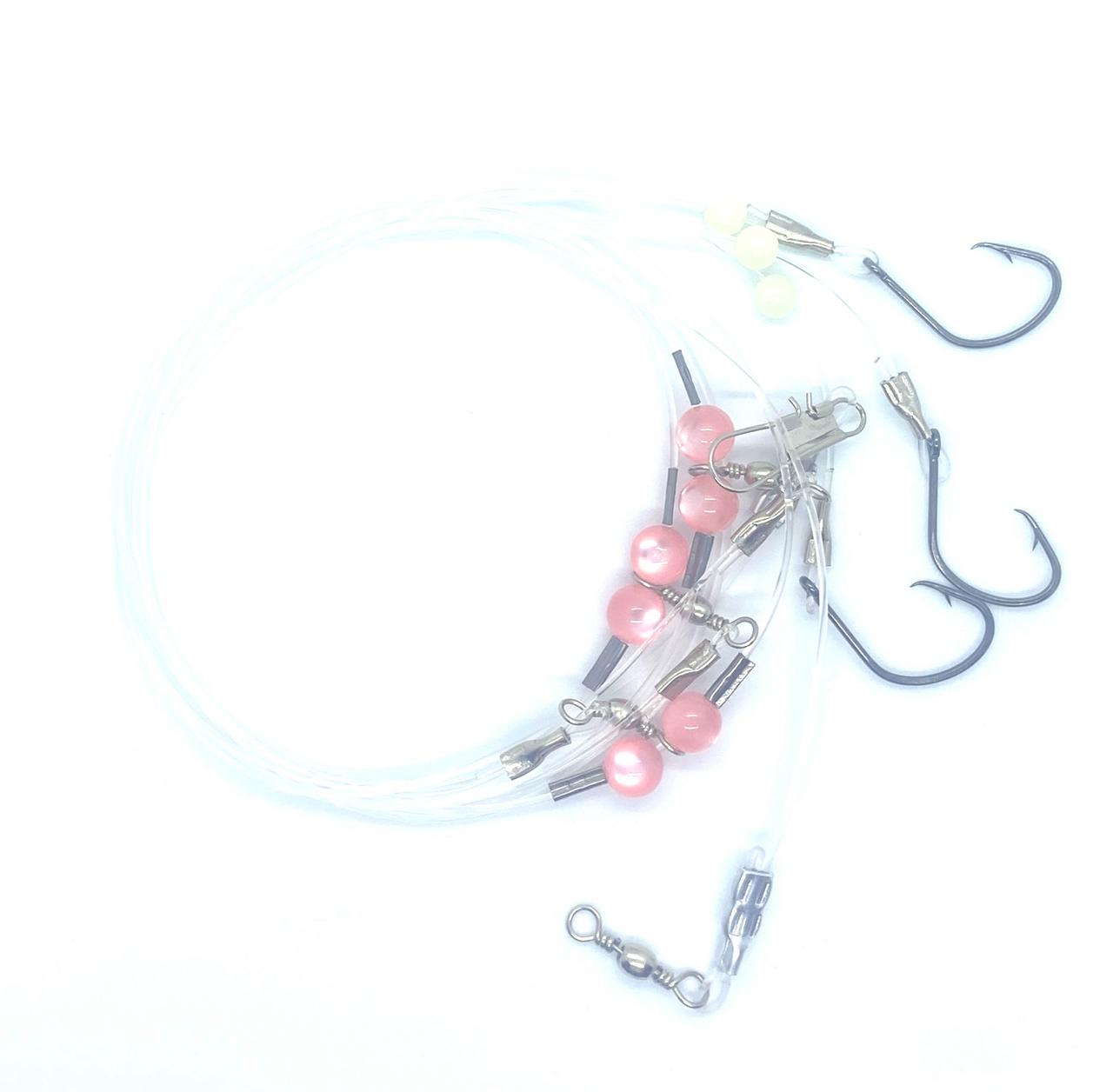 Componentes: 1 Girador 1/0 com Snap de engate rápido, 2,20m de linha central de 1.4mm, Pernadas de aproximadamente 40cm com linha de 1.2mm, Miçangas, 3 giradores N3, anzóis Circle Hook e presilhas de aluminio.